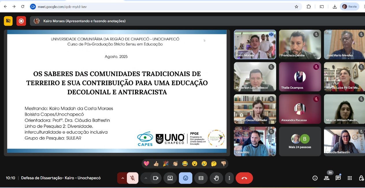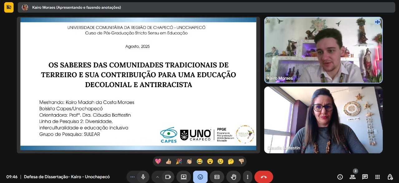 O mestrando Kairo Madah da Costa Moraes apresentou no dia 29 de agosto de 2025 a pesquisa intitulada “Os saberes das comunidades tradicionais de terreiro e sua contribuição para uma educação decolonial e antirracista” com a orientação da prof.ª Dra. Cláudia Battestin e com banca composta pelos professores Dr. Anderson Luiz Tedesco (Unoesc-SC), Dr. José Mario Méndez (Universidad Nacional – UNA, Costa Rica) e Dra. Márcia Luiza Pit Dal Magro (Unochapecó-SC).