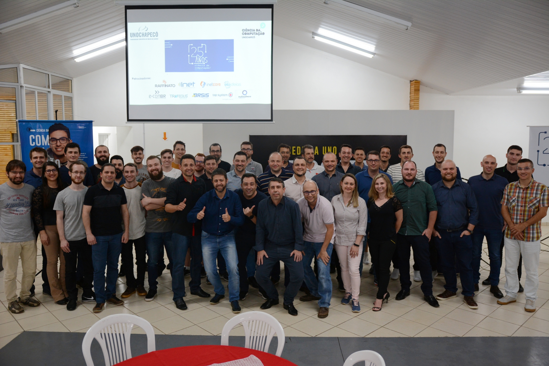 Hoje em dia, as inovações tecnológicas são cada vez mais frequentes. Se comparar um celular lançado no ano passado com um lançado neste ano, por exemplo, com certeza terão funcionalidades que já são ultrapassadas. Agora imagine como era o cenário há 25 anos, quando os computadores começaram a se popularizar em nossa região. O desafio em trazer um curso para estudar o desenvolvimento de softwares era enorme. Para celebrar o aniversário de 25 anos do curso de Ciência da Computação da Unochapecó e todo o desenvolvimento da região que surgiu a partir dele, professores, egressos e estudantes se reuniram na última quinta-feira (10/10) para uma noite de homenagens.