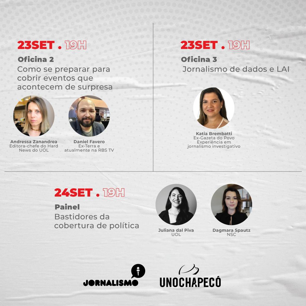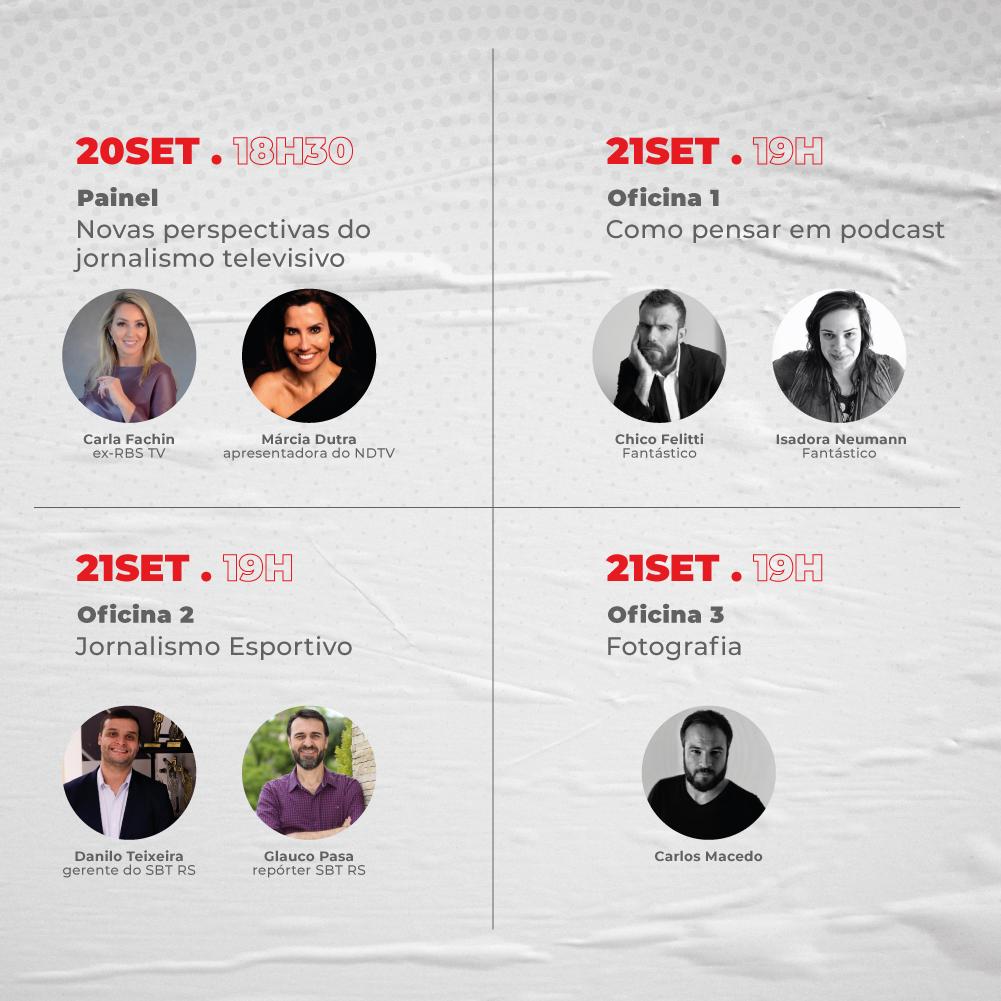 Na terça-feira (21/09), das 19h às 22h35 os participantes terão três opções de oficina. A primeira será ministrada por Chico Felitti e Isadora Neumann da Silva, sobre 'Como pensar em podcast'. Esta atividade ocorre no mesmo horário na quarta-feira (22/09). Ainda na terça-feira, ocorrerá uma oficina sobre 'Jornalismo Esportivo', com Danilo Teixeira e Glauco Pasa, e uma oficina de 'Fotografia', ministrada por Carlos Macedo.