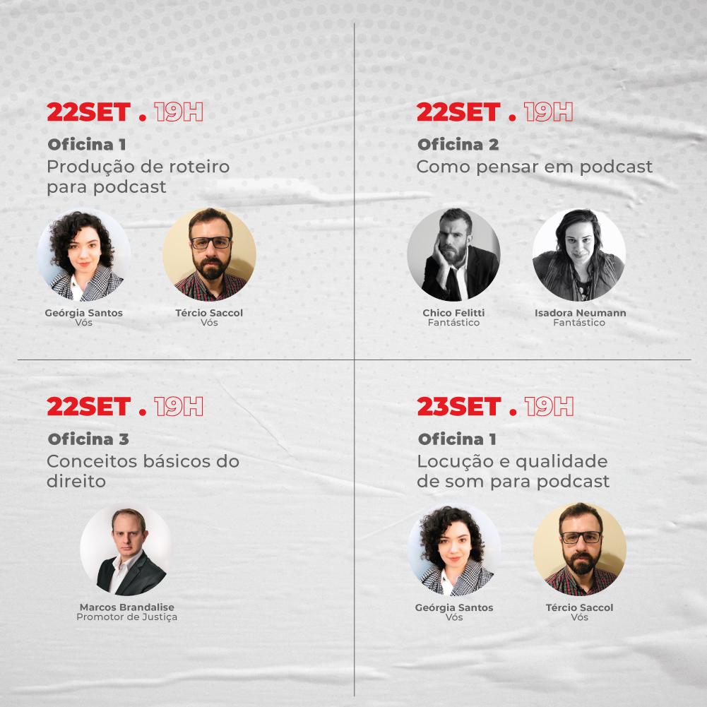 A noite de quarta-feira (22/09) contará com outras duas opções de oficinas. Uma delas será sobre 'Produção de Roteiro para Podcast', com Geórgia Santos e Tércio Saccol. A segunda opção traz 'Conceitos Básicos do Direito', com o