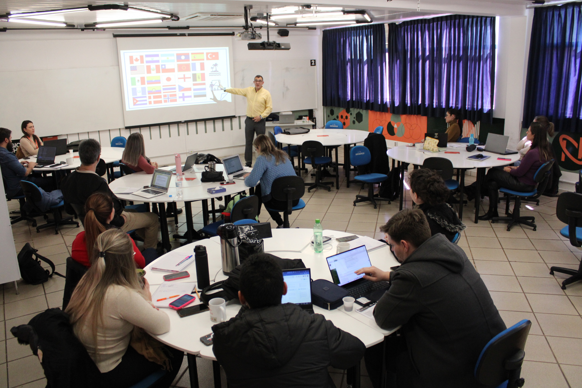 Durante 11 dias do mês de maio, que permaneceu na Instituição, o professor ministrou palestras, workshops e curso de conversação em língua inglesa na graduação e pós-graduação, no Colégio Unochapecó e no Pollen Parque Cientifico e Tecnológico.