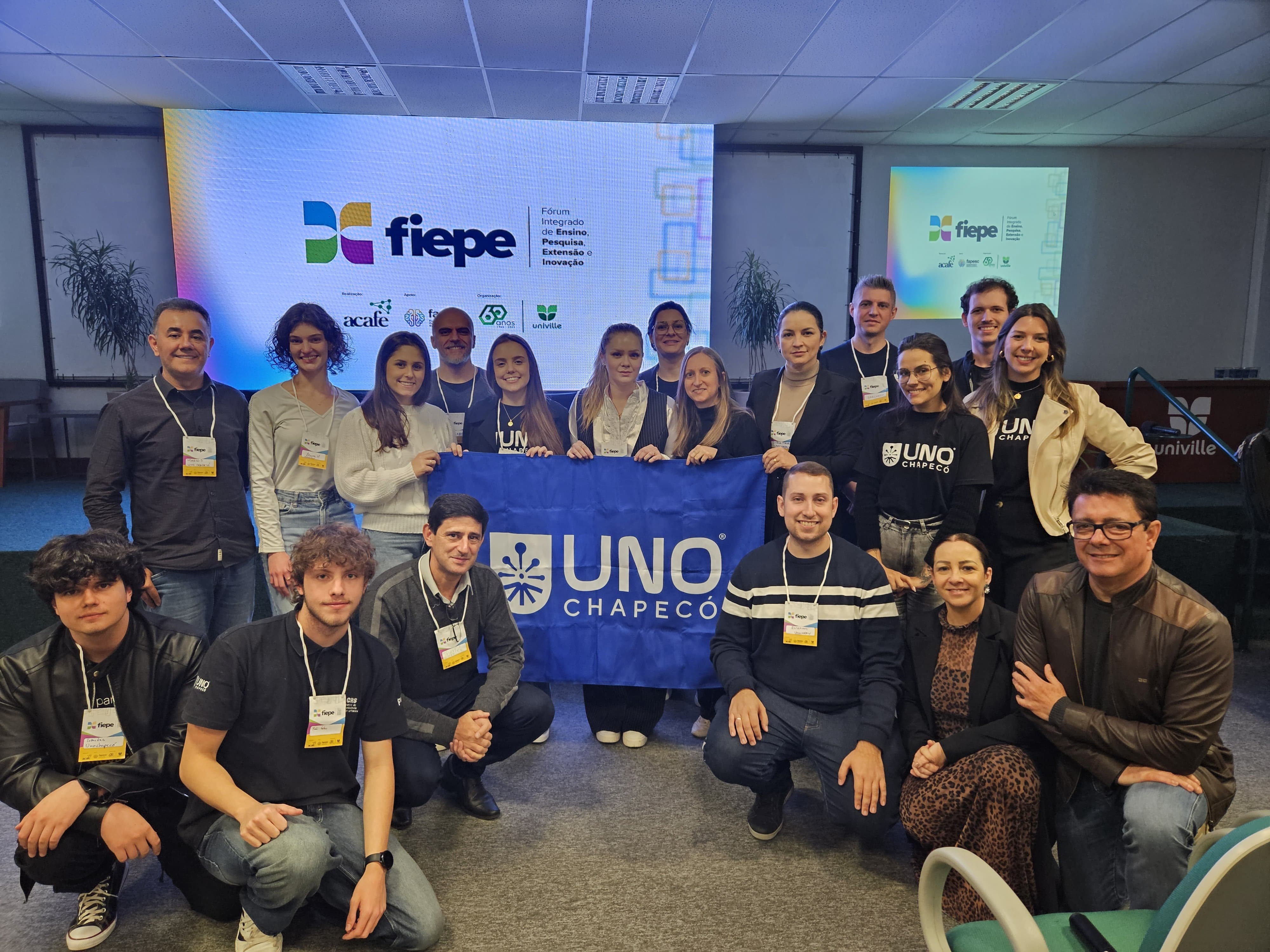 Chapecó, 03 de junho de 2025 - Nos dias 28 e 30 de maio, a Unochapecó esteve presente no X Fórum Integrado de Ensino, Pesquisa, Extensão e Inovação (FIEPE) da Associação Catarinense das Fundações Educacionais (ACAFE), realizado na Univille, campus Joinville. O evento reuniu representantes das 14 Instituições de Ensino Superior comunitárias do estado, com o objetivo de promover a integração e fortalecer a construção coletiva do conhecimento.