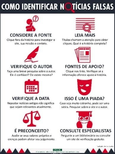 Para sistematizar e disseminar essas informações a IFLA produziu a cartilha “Como identificar notícias falsas”, como pode ser visto a seguir: