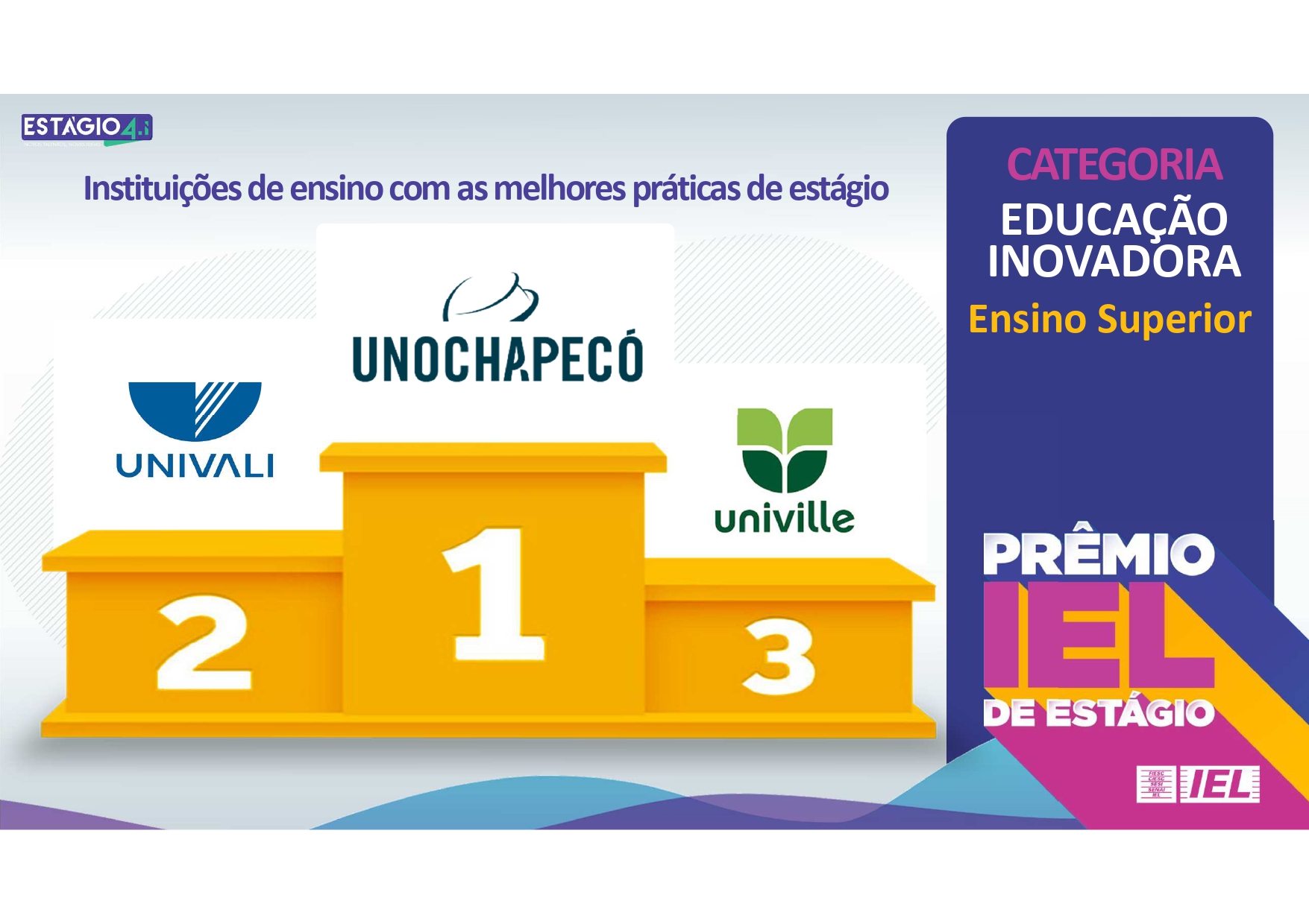 O Instituto Euvaldo Lodi (IEL) reconhece os projetos, empresas e instituições de ensino com melhores práticas de estágio. De acordo com a coordenadora do setor de Estágios e Monitorias da Unochapecó, Taiz Balardin Antonini, este é um reconhecimento da atuação e experiências de estágios da Universidade.